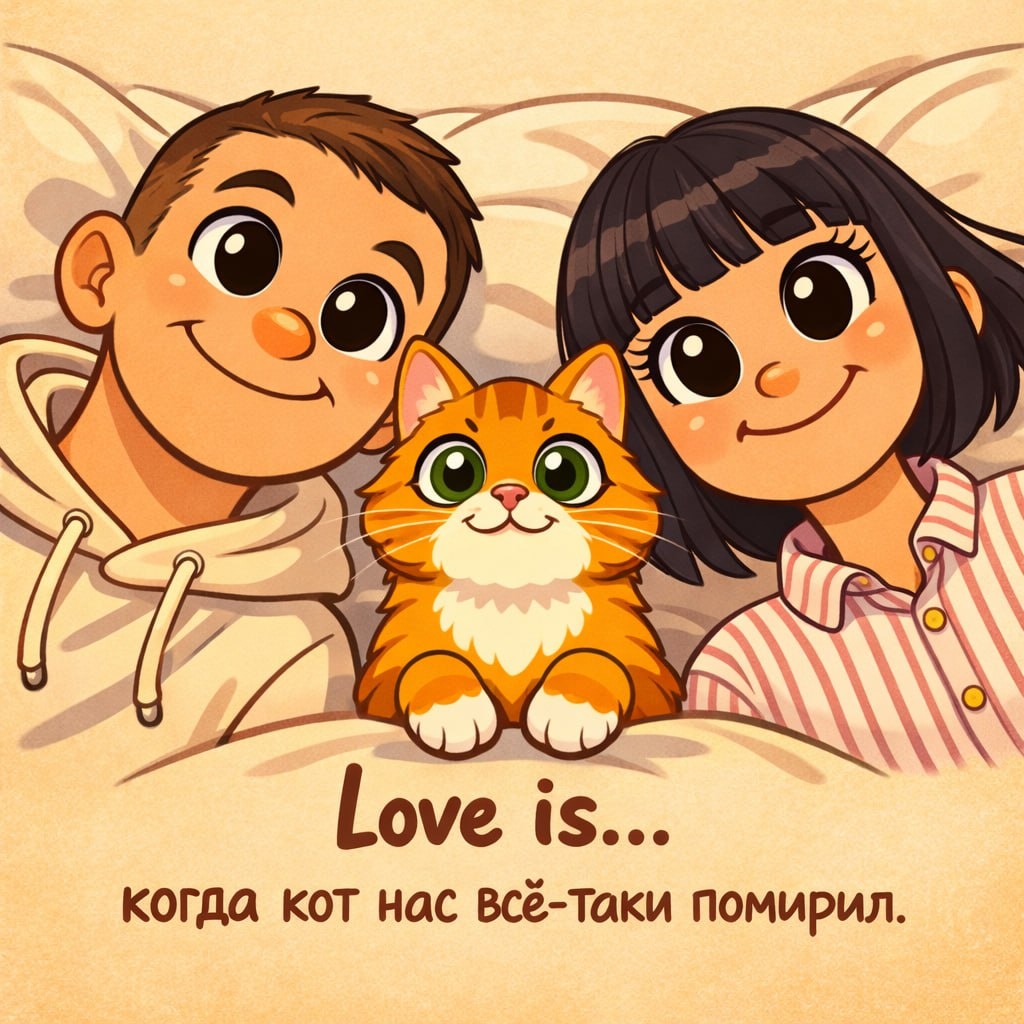 Бесплатно и без навыков дизайна. ⠀ Сейчас не нужно быть дизайнером, чтобы создать шедевр. Вы просто описываете идею словами, а искусственный интеллект рисует картинку, которую не стыдно: 🔸 отправить в личку любимому человеку, 🔸 распечатать и положить под подушку, 🔸 выложить в сторис, собрав сотни «огоньков» 🐱 ⠀ И да, это абсолютно бесплатно. Никаких подписок и демо-версий. ⠀ Помните те самые комиксы из детства? Мальчик и девочка, минималистичные чёрно-белые рисунки и фразы «Love is… проснуться раньше и сделать кофе» «Love is… делить наушники в метро» Теперь в этом стиле можете быть ВЫ. Ваши лица, ваши привычки, ваши смешные фразочки, которые понимаете только вы двое. ⠀ Как это работает? 💛❤️❤️❤️ - Берёте фото (или просто придумываете сюжет). - Загружаете в нейросеть / пишете промт. - Получаете персонализированную открытку за 20 секунд. ⠀ Где генерировать? 💛❤️❤️❤️ Подойдёт любая нейросеть с генерацией изображений: — Kandinsky 3.0 / 4.0 (Сбер, отлично понимает русский) — Шедеврум