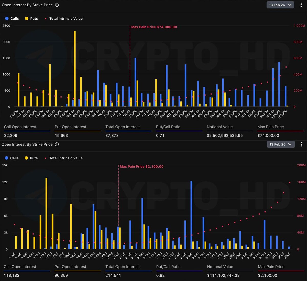 ) $2,5b в опционах на #BTC и $414m в опционах на #ETH. ▫️Зона основного интереса в BTC = $74,000 ▫️Зона основного интереса в ETH = $2100 Crypto Headlines