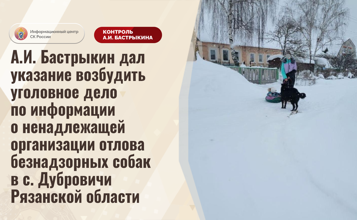 А.И. Бастрыкин дал указание возбудить уголовное дело по информации о ненадлежащей организации отлова безнадзорных собак в с. Дубровичи Рязанской области В Информационный центр СК России обратилась жительница Рязанской области по вопросу ненадлежащего отлова безнадзорных собак в селе Дубровичи. В феврале текущего года два агрессивных животных набросились на женщину с ребенком. Получения телесных повреждений удалось избежать благодаря помощи, оказанной заявительницей. Обращения в компетентные органы результатов не принесли, мер реагирования не принимается. Указанная ситуация освещалась в СМИ и социальных сетях. В СУ СК России по Рязанской области организована процессуальная проверка. Председатель Следственного комитета Российской Федерации Александр Иванович Бастрыкин дал указание руководителю СУ СК России по Рязанской области Олегу Алексеевичу Васильеву возбудить уголовное дело и представить доклад о ходе и результатах его расследования. Исполнение поручения поставлено на контроль в це