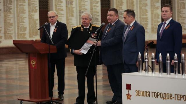 В Музей Победы в Москве переданы капсулы с землей 11 городов-героев, включая Волгоград, и Брестской крепости-героя. Как сообщает пресс-служба Волгоградской областной думы, вместе со священной землей с Мамаева кургана делегация Волгоградской области передала музею книгу «Сталинград. Без срока давности».