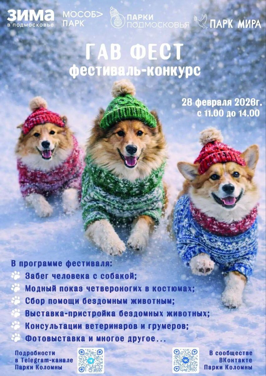 !!! В парке Мира состоится самый душевный и пушистый фестиваль-конкурс "ГАВ ФЕСТ"! Это не просто событие - это день радости, игр и новых друзей для тех, кто обожает четвероногих. Что вас ждёт: 😎 забег человека с собакой; 💯 модный показ четвероногих; 😋 сбор помощи бездомным животным; 🕺 фотовыставка и многое другое... ❤️ Парк Мира 👋 28 февраля, с 11.00 до 14.00 👍Станьте частью праздника. Заявите питомца на конкурс! Подробности в Положении⬇️ #ГавФест #ПаркиПодмосковья #ПаркиКоломны #ЗимавПодмосковье #ЗимавКоломне