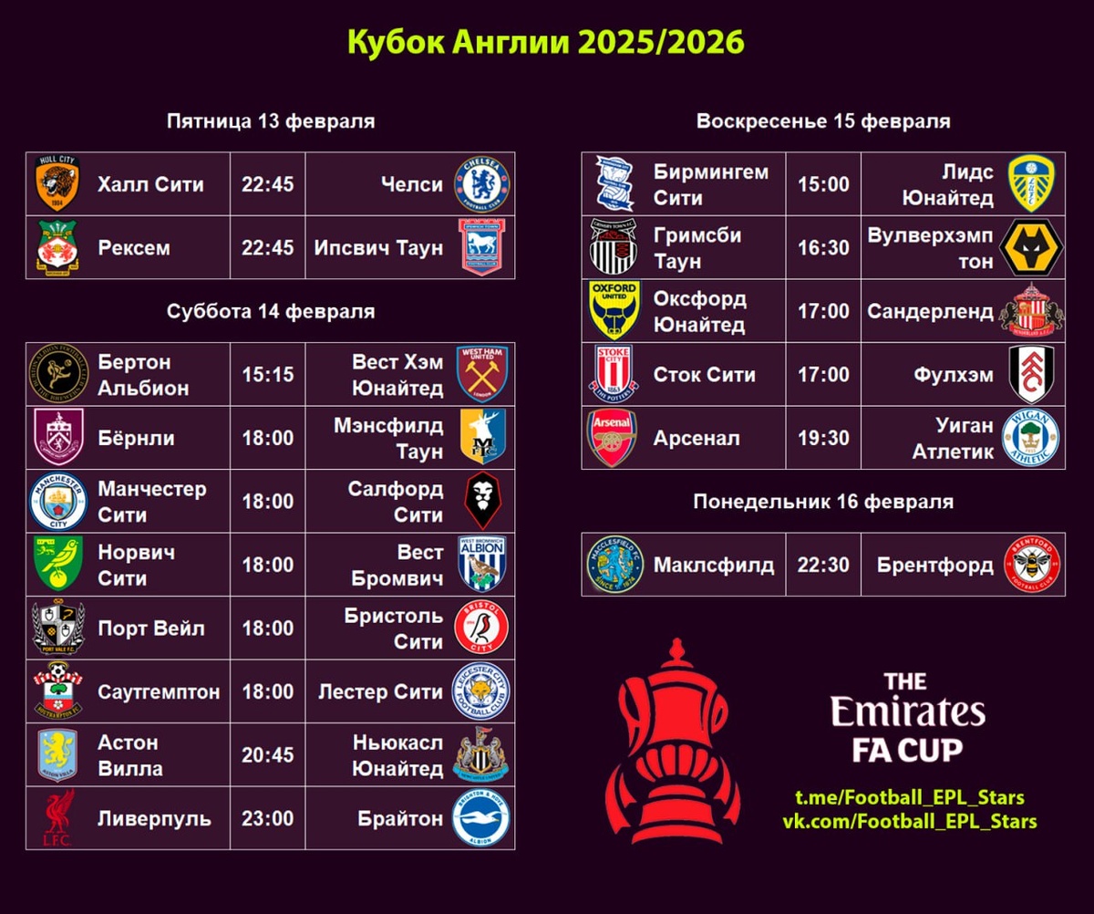 Расписание матчей Кубка Англии. 1/16 финала.
