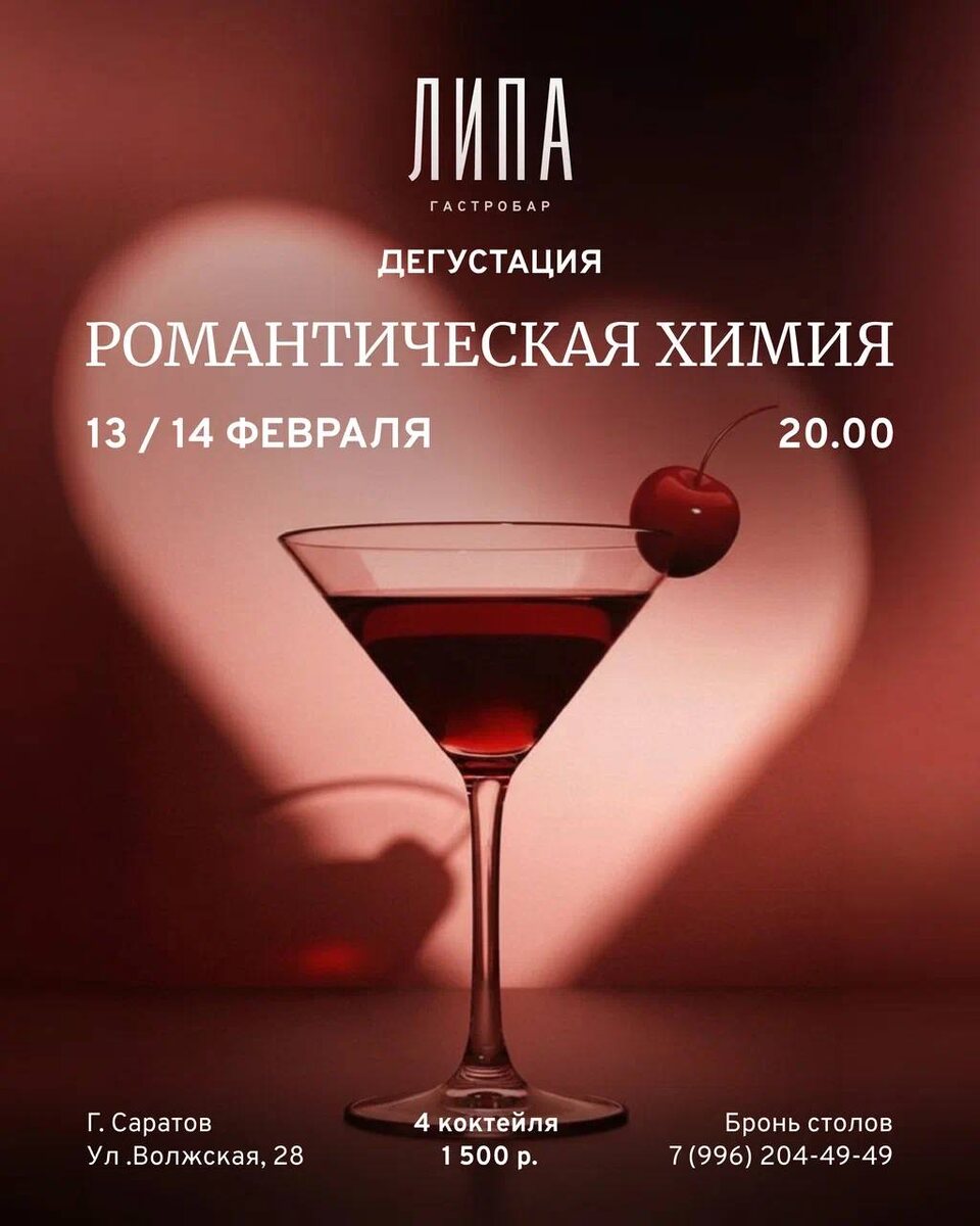Позвольте себе раствориться в магии момента, где химия чувств превращается в изысканные миксы, дарящие вдохновение и близость. Идеальное событие для тех, кто хочет сказать «люблю» без слов. 4 авторских коктейля — 1500 ₽ 🕗 20:00 Бронь столов: +79962044949