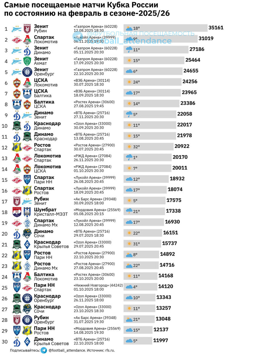 Предлагаю взглянуть на рейтинг игр с наибольшей аудиторией текущего сезона Кубка. Тут не настолько многолюдно и ярко по цифрам, как в РПЛ, однако некоторые интересные моменты важно отметить. • Из-за того, что «Зенит» сыграл лишь четыре матча дома, освободилось гораздо больше места для других команд в рейтинге. В топ-5 сразу четыре домашних встречи «Зенита» от 24.6 до 35.1 тыс. зрителей. • Лучший матч не из Санкт-Петербурга — игра «Спартака» и «Локо» на «Лукойл Арене» (31019). В топ-10 также есть две «домашки» ЦСКА и по одной «Балтики», «Динамо» и «Краснодара». • Также из любопытного, безусловно, матч двух любительских команд на 18-м месте — «Шумбрат» и «Кристалл-МЭЗТ» благодаря широкому промо собрали более 17 тысяч болельщиков. Однако на постоянной основе на «Шумбрат» ходит 184 зр./матч. • Отмечу и первую игру в Нижнем Новгороде после возвращения «Пари НН» на родной стадион — 14130 человек пришли на встречу со «Спартаком». Последующие домашние игры «Пари НН» показали, что это была всё-