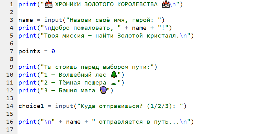 На этом занятии мы создадим большую текстовую игру с сюжетом, где будем активно использовать: Игра получится с разными событиями, очками и финалом 🎮 В древнем королевстве пропал Золотой кристалл.