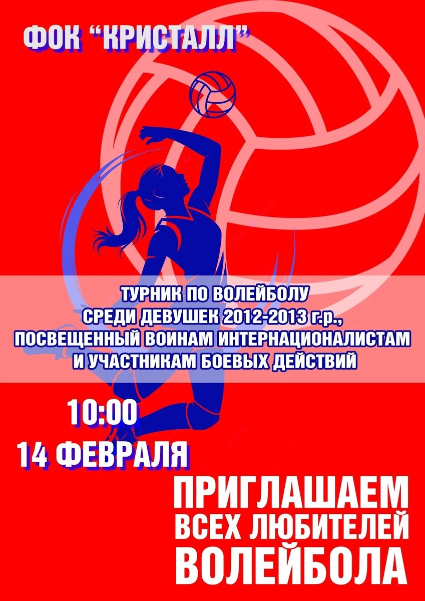 ! В Борисоглебске пройдёт турнир по волейболу среди девушек 2012–2013 гг. р., посвящённый воинам-интернационалистам и участникам боевых действий. 📍 Где? ФОК «Кристалл» ⏰ Когда? 14 февраля в 10:00 Любители волейбола, приходите поддержать наших юных спортсменок. Берите друзей, включайте голос на максимум и заряжайтесь спортивной атмосферой!