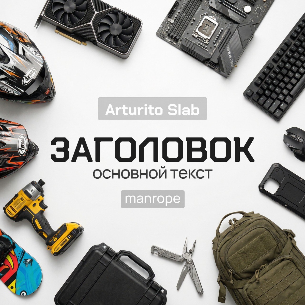 Текст: Manrope Мощный, угловатый заголовок Arturito Slab отлично подходит для мужских ниш: инструменты, автотовары, спорт, строительство. В паре с геометричным и читабельным Manrope. Заголовок: Chicoree Em.