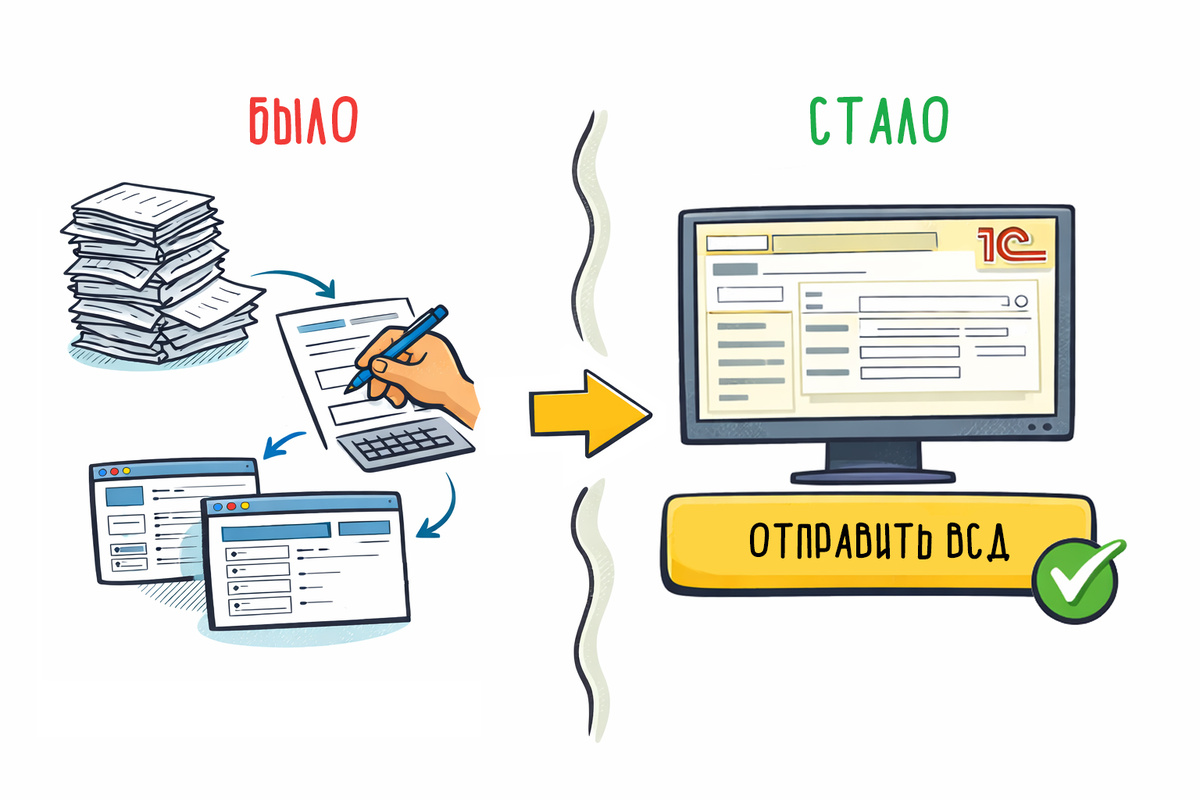 Когда «Меркурий» стал обязательным, задача была не про “красивое внедрение”. Нужно было настроить работу так, чтобы документы оформлялись стабильно и быстро — без часов в веб-интерфейсе и бесконечного ручного выбора партий. При этом у «Троянда-Крым» важное ограничение: учет ведется в 1С 7.7, а решений под “семёрку” на рынке тогда практически не было. Поэтому цель сформулировали прагматично: сделать ежедневную отправку ВСД нормальным процессом из 1С. То есть: Сейчас схема работы выглядит просто: утром синхронизировали данные — дальше отдел спокойно работает. Ирина описывает это одной фразой: «С утра загрузили партии — и пошли отправлять ВСД». Главный эффект — меньше ручной рутины и меньше ошибок на повторяющихся действиях: базовые операции выполняются из 1С, а ручной труд остается только там, где он действительно оправдан. «Мы работаем с КБ99 давно — выбрали вас потому, что под 1С 7.7 тогда почти не было альтернатив. Самое ценное — автоматизация отправки ВСД: стало реально легче, не ну