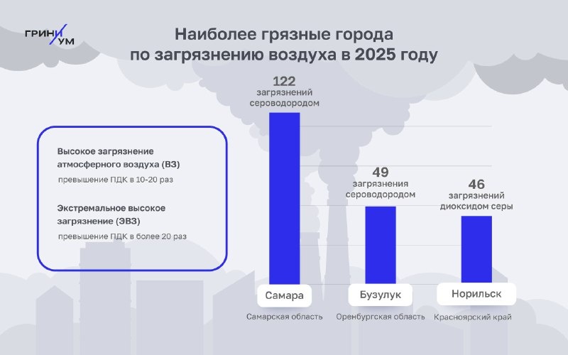 Гриниум провел комплексный анализ ежемесячных сообщений Росгидромета об аварийном, экстремально высоком и высоком загрязнении окружающей среды на территории России и узнал, как менялся уровень загрязнения в разных регионах в 2025 году. Качество атмосферного воздуха в 2025 году снизилось по сравнению с 2024 годом, к тому же общее число инцидентов увеличилось на 50% по сравнению с 2024 годом, что стало рекордным показателем. Так, больше всего зарегистрированных инцидентов (17%) пришлось на июль, меньше всего — на январь (2%). Загрязнения характеризовались соотношением аварийных (2), высоких (41) и экстремально высоких (1) случаев. Регионами с максимальным числом случаев загрязнений стали: В Самарской области были зафиксированы превышения концентраций загрязняющих веществ до 71,9 ПДК. По данным наблюдений метеорологических станций Москвы, наиболее загрязненными районами стали: Загрязнения также отмечались в районах Богородское, Дмитровский, Зябликово, Мещанский, Останкинский, Печатники, Р