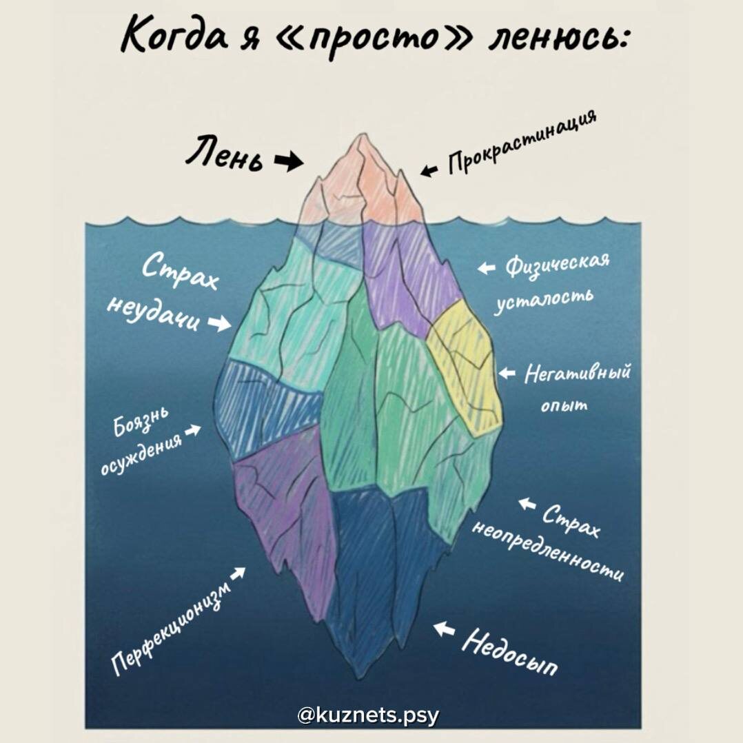 Лень не черта характера.Это поведение, которое запускает психика, когда чувствует угрозу. Когда ты откладываешь задачу, мозг часто реагирует не на саму работу, а на страх неудачи, осуждения или неопределённости. Нервная система выбирает избегание как способ снизить тревогу. Это краткосрочное облегчение, но долгосрочно оно усиливает напряжение и прокрастинацию. Поведение «откладываю» не диагноз.Это реакция психики на конкретный фактор. Эмоциональные блоки.Страх ошибки активирует тревожную реакцию и избегание. Боязнь осуждения включает социальную тревогу психика защищает от возможного стыда. Синдром самозванца усиливает сомнение в компетентности, и мозг выбирает не действовать, чтобы не подтвердить «я не справлюсь». Физические причины.Выгорание это истощение нервной системы, а не слабость характера. Сенсорный перегруз снижает концентрацию и усиливает раздражительность. Дефицит ресурса (сон, питание, отдых) напрямую влияет на способность к действию, биология первична. Ментальные ловушки.П