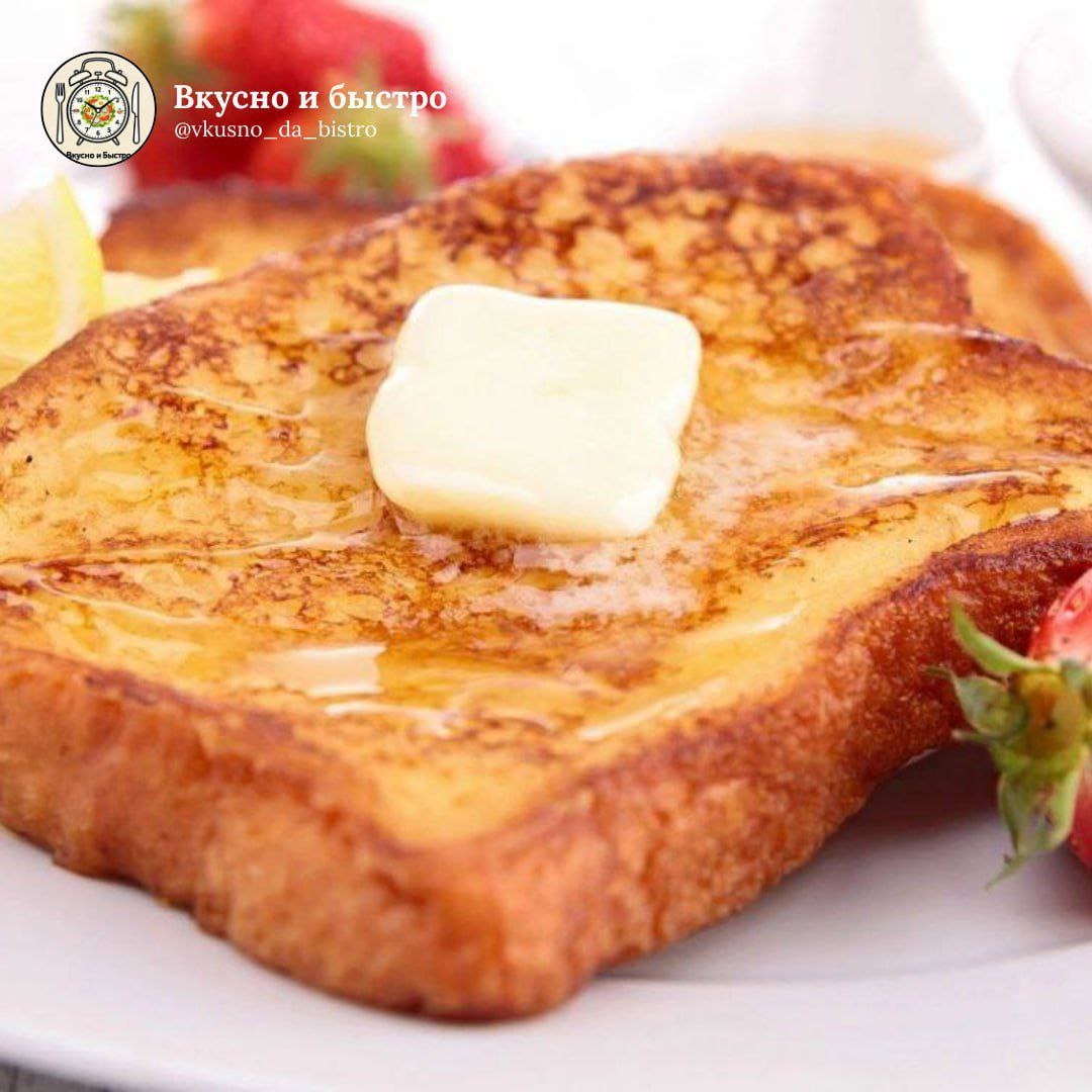 #тосты #15мин 🕒 Время приготовления: 15 минут Порции: 4 Сложность: легко 🧾 Ингредиенты: 🟠Яйца — 4 шт. 🟠Молоко — 1/4 стакана 🟠Ваниль — щепотка 🟠Корица — щепотка 🟠Мускатный орех — щепотка 🟠Сахар — 2 ст. л. 🟠Сливочное масло — 5 ст. л. 🟠Хлеб (бриошь, толстые ломтики) — 8 шт. 🟠Кленовый сироп — 4 ст. л. 🍴Приготовление: 1. Смешайте сахар, ваниль, корицу и мускатный орех. Отдельно взбейте яйца с молоком и соедините с сахарной смесью. Размешайте до растворения сахара. 2. Разогрейте на сковороде немного сливочного масла. 3. Каждый ломтик хлеба хорошо окуните в яично-молочную смесь, чтобы он пропитался. 4. Обжаривайте тосты на среднем огне с двух сторон до румяной золотистой корочки. Вкусно и Быстро | Мы в Мах 📲