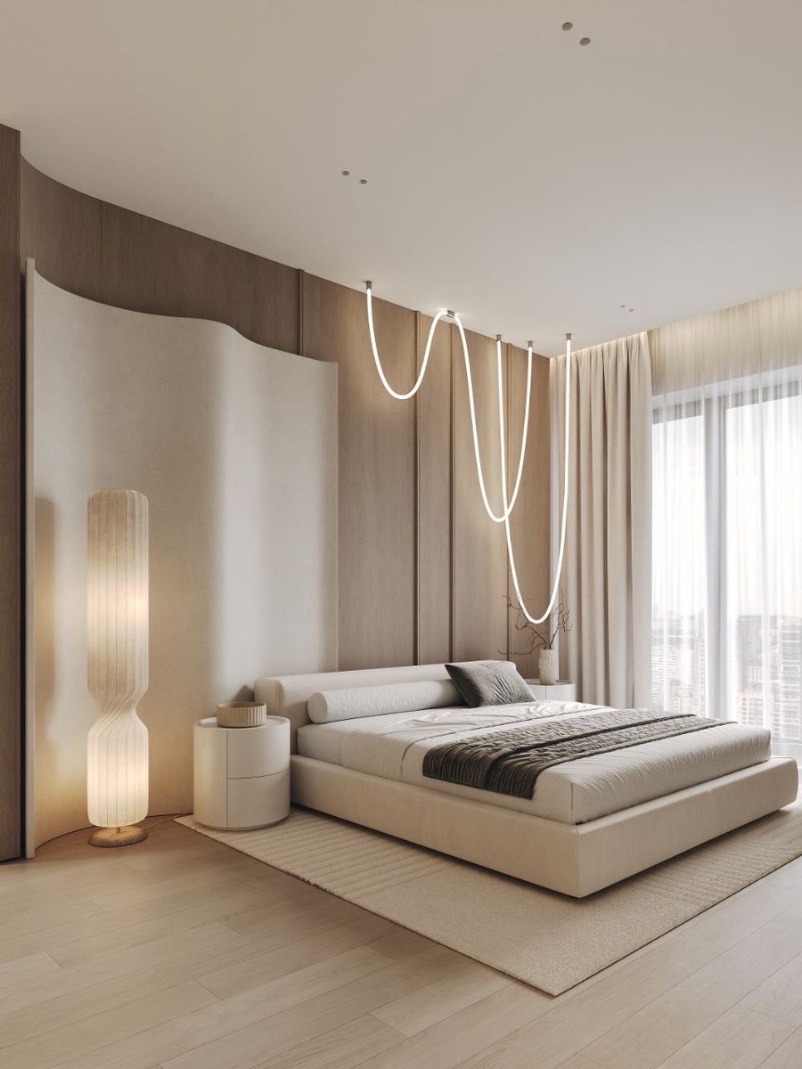 - Скульптурная световая линия (гибкий световой элемент/«неоновая» лента в мягком формате) над изголовьем — функциональный и эмоциональный свет одновременно.