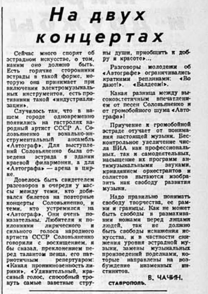 Сейчас много спорят об эстрадном искусстве, о том, каким оно должно быть. Есть горячие сторонники эстрады в такой форме, которую она принимает при включении электромузыкальных инструментов, есть противники такой «индустриализации». Случилось так, что в нашем городе одновременно появились на гастролях народный артист СССР А. Соловьяненко и вокально-инструментальный ансамбль «Автограф». Для выступлений Соловьяненко была отведена эстрада в здании краевой филармонии, а для «Автографа» – арена в цирке. Довелось быть свидетелем разговоров в очереди у кассы между теми, кто добивался билетов на повторные концерты Соловьяненко, и теми, кто устремился на «Автограф». Они очень показательны. Любители и поклонники лирического и сильного голоса народного артиста СССР Соловьяненко говорили с восхищением, я бы сказал, преклонением перед талантом певца, его патриотичным репертуаром: «Какая проникновенность лирики», «Удивительный, красивый голос, способный тронуть самые заветные струны души, приобщить к