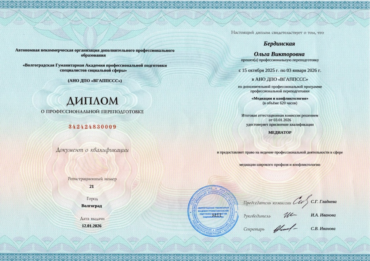 ! Друзья, сегодня хочу поделиться с вами своим профессиональным достижением. Я получила диплом и официальный статус Медиатора. Теперь я помогаю не только разбираться с чувствами, но и договариваться юридически грамотно. ❓ Что такое медиация и кто такой медиатор? Если говорить просто: Медиатор — это нейтральный посредник. Не судья, который решает, кто виноват, и не адвокат, который защищает только одну сторону. Моя задача как медиатора — организовать переговоры так, чтобы вы перестали воевать и нашли решение, которое устроит обе стороны. Без криков, манипуляций и битой посуды. Теперь я провожу: 🔹 Семейную медиацию: разводы, раздел имущества, споры о детях (с кем жить, как общаться). 🔹 Медиацию трудовых споров: конфликты между сотрудниками и руководством или внутри коллектива. ⚖️ Почему это серьезно? (Важный момент!) Медиация — это не просто «посидели, поговорили». В России действует закон о процедуре медиации (193-ФЗ). Это официальный способ досудебного урегулирования споров