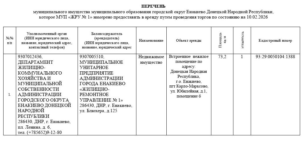 ! Предоставляем перечень муниципального имущества муниципального образования городского округа Енакиево, которое МУП «ЖРУ №1» намерено предоставить в аренду путем проведения торгов по состоянию на 10.02.2026. Подписывайтесь на наш канал в MAX.