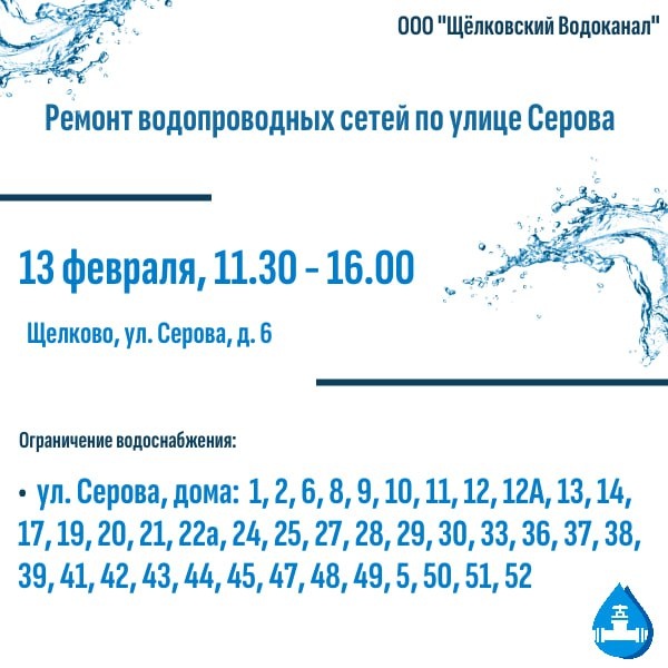 В связи с устранением течи на сетях холодного водоснабжения на трубопроводе диаметром 100 мм по адресу: ул. Серова, д. 6 остановлена подача холодного водоснабжения 13 февраля с 11.30 до 16.00 в ИЖС по адресам: ➡️ ул. Серова, д. 1, 2, 6, 7, 8, 9, 10, 11, 12, 12А, 13, 14, 17, 19, 20, 21, 22. 22а, 24, 25, 27, 28, 29, 30, 33, 36, 37, 38, 39, 41, 42, 43, 44, 45, 47, 48, 49, 5, 50, 51, 52 Приносим извинения за доставленные неудобства. Телефон аварийно-диспетчерской службы Водоканала: 84965621172.