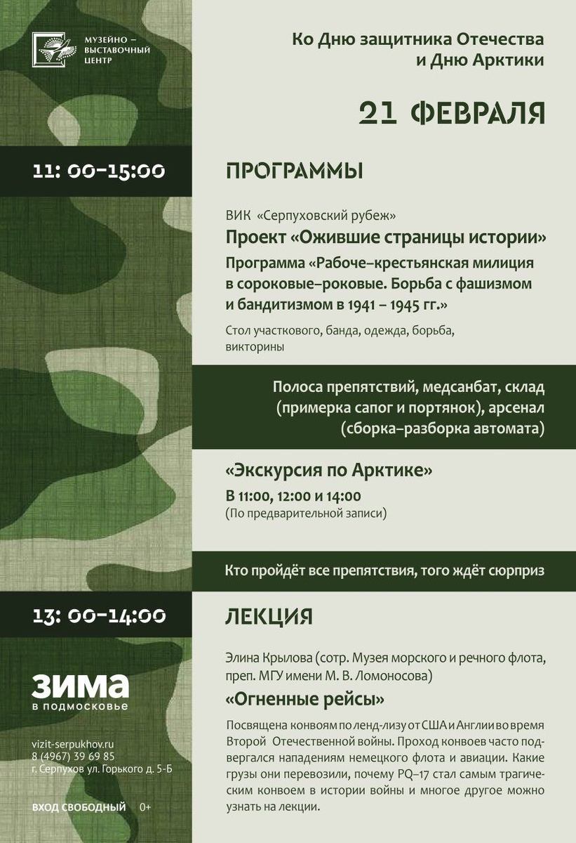 С 11:00 до 15:00 | 🔸️ «Ожившие страницы истории» – интерактивный проект. 💁♀️ Что вас ждет: Стол участкового, история о бандитах, историческая одежда, викторины. 🔸️Активности: Полоса препятствий, медсанбат, склад (примерка сапог и портянок), арсенал (сборка-разборка автомата). 🎁 Сюрприз! ❄️ «ЭКСКУРСИЯ ПО АРКТИКЕ» Отправляемся в самое холодное и загадочное путешествие! ️ ⚠️ Сеансы:11:00, 12:00 и 14:00. 🎤 13:00-14:00 – УНИКАЛЬНАЯ ЛЕКЦИЯ: «Огненные рейсы» 💁♀️ Лектор:Элина Крылова (сотрудник Музея морского и речного флота) Лекция посвящена конвоям ленд-лиза от США и Англии во время Второй мировой войны. 📆 21.02.2026 🕒 11:00 🏢 Музейно-выставочный центр 📍 г. Серпухов, ул. Горького, 5б 💰 Вход свободный❗ ⭐Поддержать канал голосом 💰 Канал Вакансии Серпухова ✅ Мероприятия Серпухов https://dzen.ru/id/66f01c6eb4c6fe60c9ca1608 http://vk.com/serpukhov_events http://dzen.ru/serpukhov_events