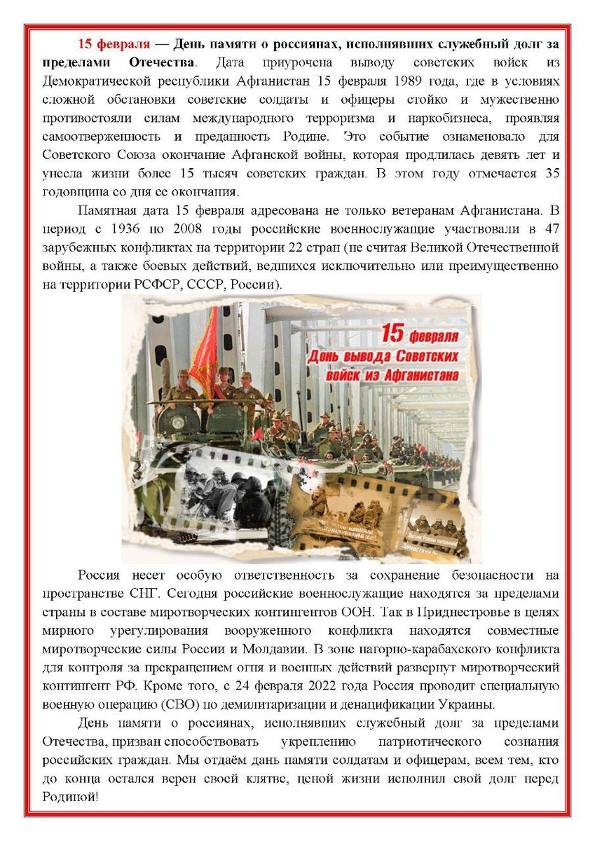 В преддверии одной из самых значимых дат в истории нашей страны информационно-библиотечный центр ДГУЮ Минюста России подготовил специальную справку, посвящённую событию, определившему судьбы тысяч людей и целого поколения. 15 февраля 1989 года последняя колонна советских войск покинула территорию Афганистана, завершив девятилетний период участия в афганском конфликте. Эта дата стала символом не только завершения военной кампании, но и данью памяти всем, кто с честью и мужеством исполнял свой интернациональный долг вдали от Родины. День памяти о россиянах, исполнявших служебный долг за пределами Отечества, напоминает нам о цене мира, о подвиге и самопожертвовании защитников Отечества. #ДеньПамяти #15февраля #Афганистан #ИсторическаяПамять #ГимназияДонецк 📱 Telegram 📱 ВКонтакте 💙 RuTube 🖥 Наш Сайт 🎙 Радио 📱 MAX