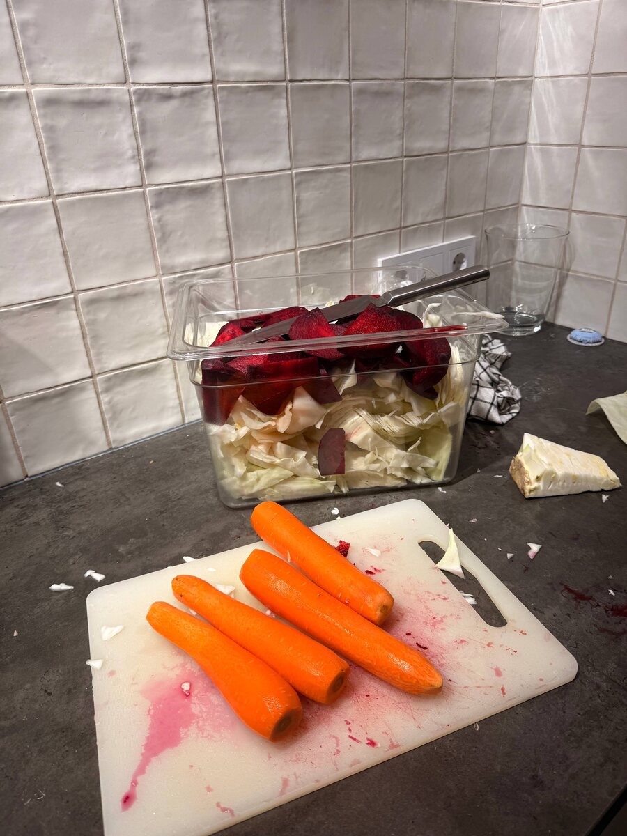 Сделала огромный контейнер с капустой, морковью и свеклой Сейчас это все должно дня 3-4 постоять при комнатной температуре, а потом добирать вкус и цвет в холодильнике. Пока не знаю, что из этого получится, но надеюсь, что будет вкусно) Если получится - расскажу как делала