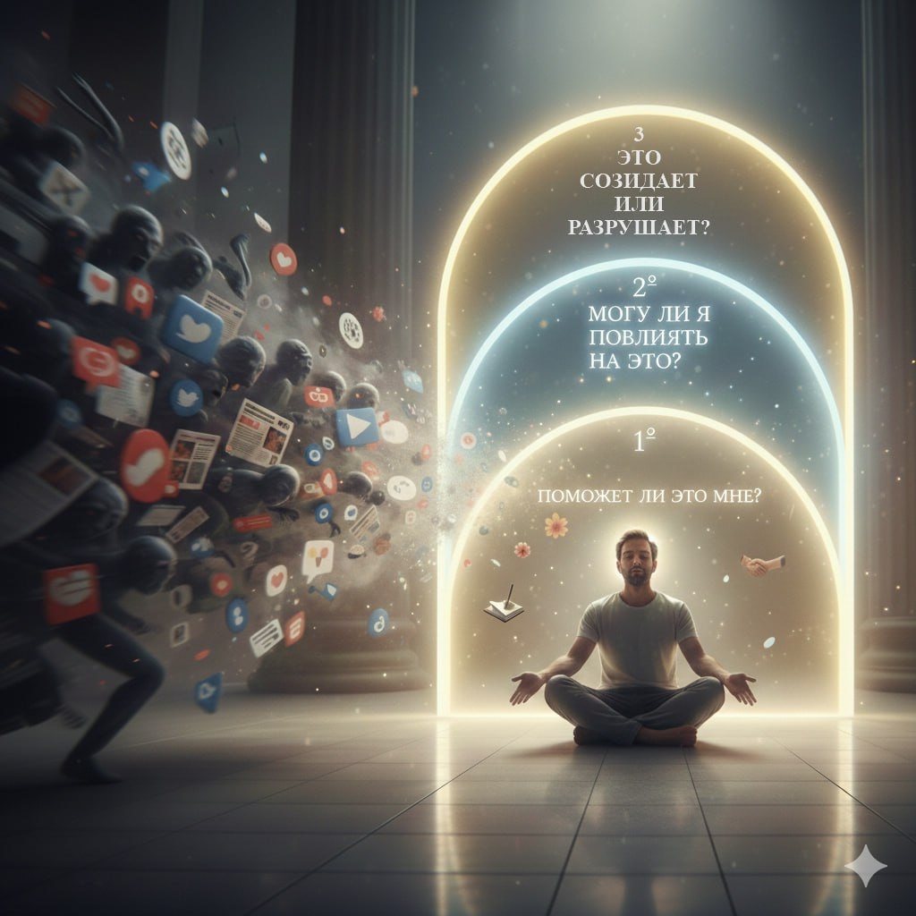 Давайте договоримся: не каждую новость и не каждый комментарий мы обязаны пускать к себе внутрь. Пусть на входе стоит небольшой фильтр - из трёх простых вопросов. Задавайте их про себя, тихо, без лишней драматизации. 1️⃣ Стану ли я лучше, узнав это? Поможет ли это вам в жизни: в работе, писательстве, отношениях, заботе о себе? Если нет - можно спокойно пролистать дальше. Не обязательно давать каждой случайной фразе право жить в вашей голове. 2️⃣ Могу ли я на это повлиять? Если вы ничего не можете сделать - ни помочь, ни изменить, ни принять решение - переживание превращается в утечку энергии. Лучше мягко вернуть внимание туда, где от ваших действий действительно что‑то зависит. 3️⃣ Это созидает или разрушает? Если после прочтения внутри поднимаются только злость, сравнение и голос внутреннего критика - это про разрушение. Если вы чувствуете поддержку, интерес, желание действовать - это про созидание. Созидающее оставляем, разрушительное отпускаем. Можно попробовать прожить хо