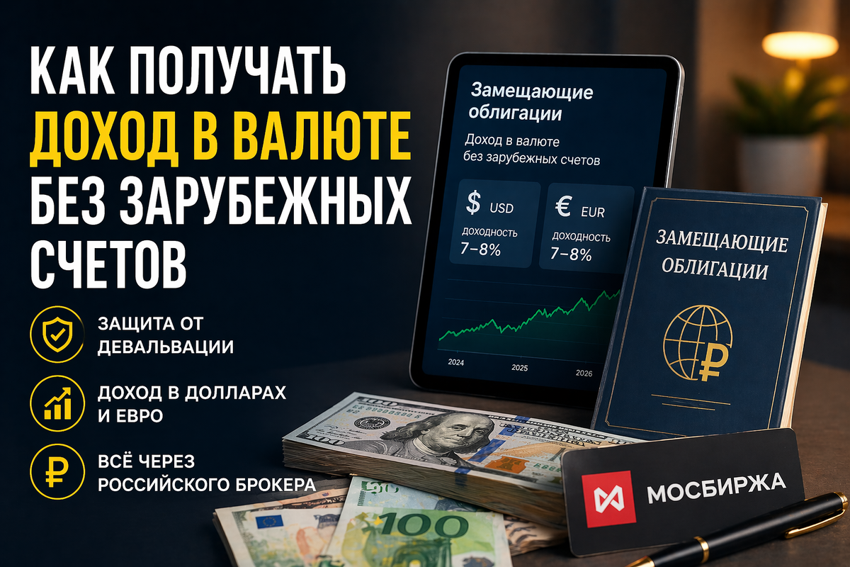 Многие до сих пор думают, что заработать в валюте можно только через валютный вклад под символические проценты. Но сегодня есть инструмент, о котором знают не все — замещающие облигации. Для части инвесторов это один из самых интересных способов получать валютную доходность без зарубежных счетов и сложной инфраструктуры. Раньше многие крупные компании выпускали евробонды — облигации в долларах и евро через иностранную инфраструктуру. После санкционных ограничений с ними возникли сложности. Тогда появился российский формат — замещающие облигации. Суть простая: То есть человек получает рубли, но сумма зависит от курса валюты. Если рубль снижается, рублёвая стоимость такой бумаги обычно растёт. Во многих случаях доходность заметно выше классических вкладов в долларах или юанях. Без зарубежных брокеров, иностранных счетов и сложных переводов. Купить можно через обычный брокерский счёт. Если хочется не просто держать деньги, а чтобы они работали. Такие инструменты нередко рассматривают как
