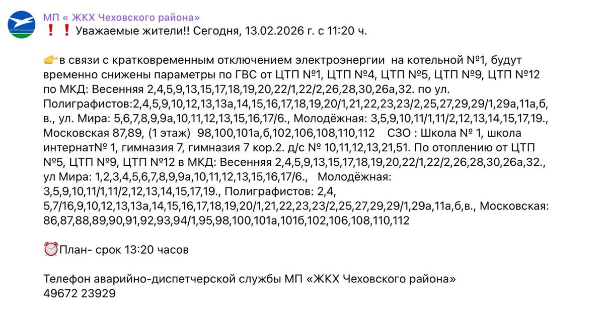 😮😱 В ЧЕХОВЕ СНОВА ОТКЛЮЧИЛИ ГОРЯЧУЮ ВОДУ БОЛЕЕ ЧЕМ В ПЯТИ ДЕСЯТКАХ МНОГОКВАРТИРНЫХ ДОМОВ, А ТАКЖЕ В ШКОЛАХ И ДЕТСКИХ САДАХ. ПРИЧИНА ВСЕ ТА ЖЕ - ПРОБЛЕМЫ С ЭНЕРГОСНАБЖЕНИЕМ.