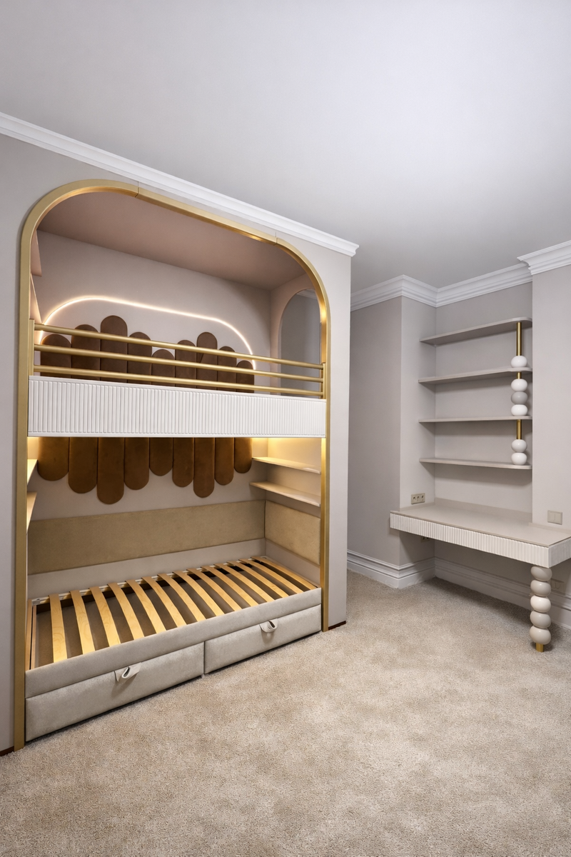 Как интерьер из дизайнерского отеля — при этом по-домашнему удобный. Мама двух детей — мальчика 2 лет и девочки 5 лет — обратилась к дизайнеру Софии с задачей: создать детскую для дочери, где каждая деталь продумана до совершенства, а интерьер сочетал уют, стиль и функциональность. София разработала авторский дизайн-проект, и мы воплотили его в жизнь «под ключ»: — элегантная двухъярусная кровать с аркой и золотыми акцентами — уютное место для сна и отдыха — мягкие панели с встроенной подсветкой, создающие тёплую и гармоничную атмосферу — два шкафа, идеально вписанные в интерьер и решающие все задачи хранения Каждая зона продумана так, чтобы было красиво и удобно каждый день — не только для красивого кадра. Рабочая зона выдержана в едином изысканном стиле: чистые линии, воздушные формы и максимальная эргономика. Всё пространство создано для того, чтобы ребёнок чувствовал себя счастливым, а родители наслаждались красотой и функциональностью интерьера. Хотите, чтобы ваша детская тоже соче