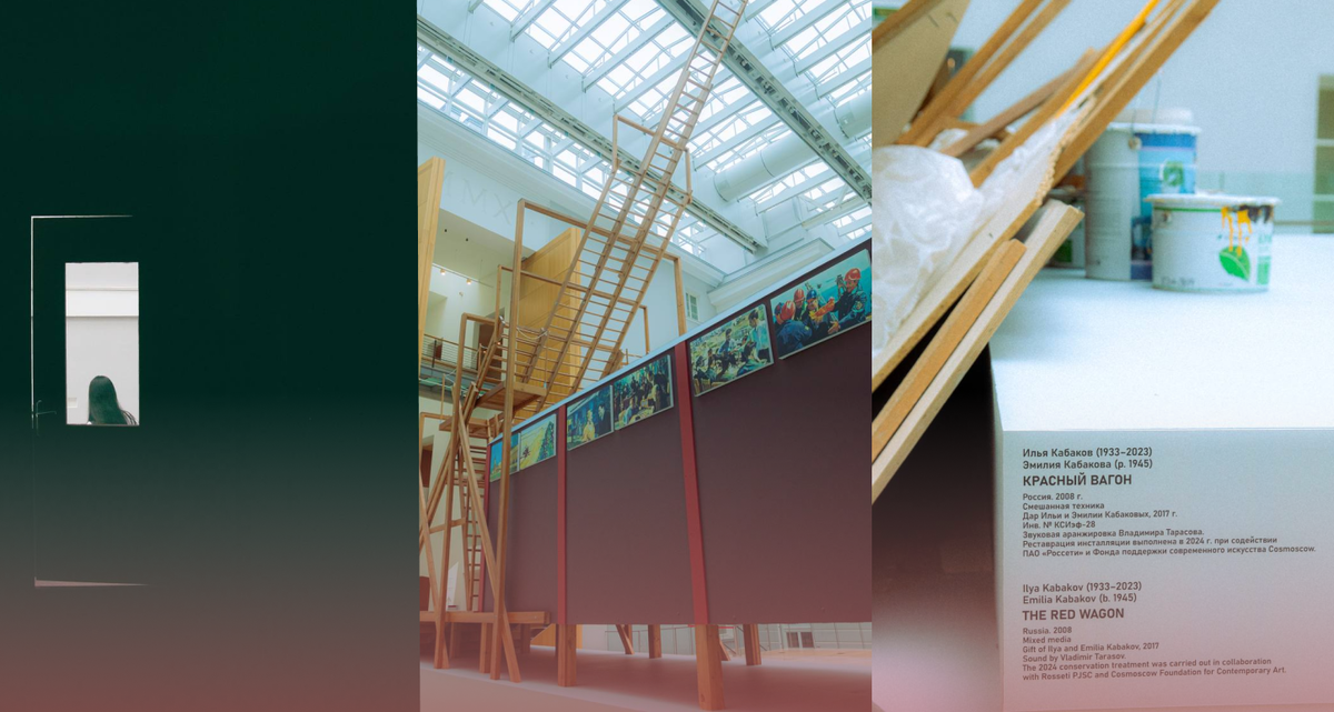 Одна из ключевых инсталляций позднесоветского и постсоветского искусства — «Красный вагон» — вновь представлена публике после длительной реставрации. Рассказываем, чем знаменит «Красный вагон» Эмилии и Ильи Кабаковых. Инсталляция передает субъективное ощущение художника от советской реальности. Перед зрителем — вагон без колес и окон, застывший в состоянии вечного ожидания движения. Он выглядит как символ обещанного пути, который так и не начинается: движение заявлено, но физически невозможно. Над вагоном закреплена лестница, ведущая к образу «светлого будущего». Однако конструкция намеренно лишена устойчивости — подняться по ней нельзя. Этот жест превращает утопическую идею в парадокс: направление существует, но доступ к нему закрыт. В этом напряжении между обещанием и невозможностью и рождается драматургия работы — ироничная, но тревожная. После реставрации зрителям вновь доступно внутреннее пространство инсталляции. Внутри — театральные кулисы и живописное полотно с образом идеализи