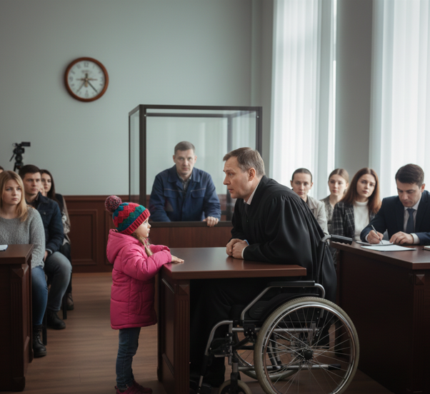 Охранник, грузный мужчина, шагнул вперед, но девочка вдруг сделала то, чего никто не ожидал. Она обошла стол и встала вплотную к инвалидному креслу судьи.