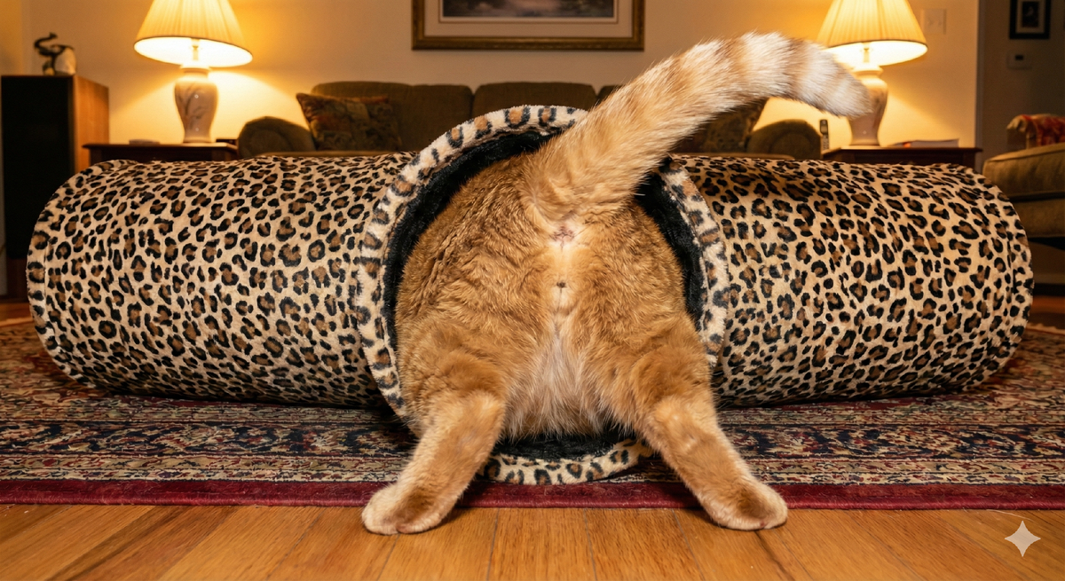 Сегодня в семь утра меня разбудил странный, скрежещущий звук, смешанный с тяжелым пыхтением. Выйдя в коридор, я увидела картину, достойную кисти сюрреалиста: из мехового туннеля торчала рыжая, внушительная задняя часть моего кота, которая, несмотря на все усилия, отказывалась двигаться дальше. По другую сторону трубы виднелась голова с выпученными от ужаса глазами и передние лапы, беспомощно гребшие воздух.