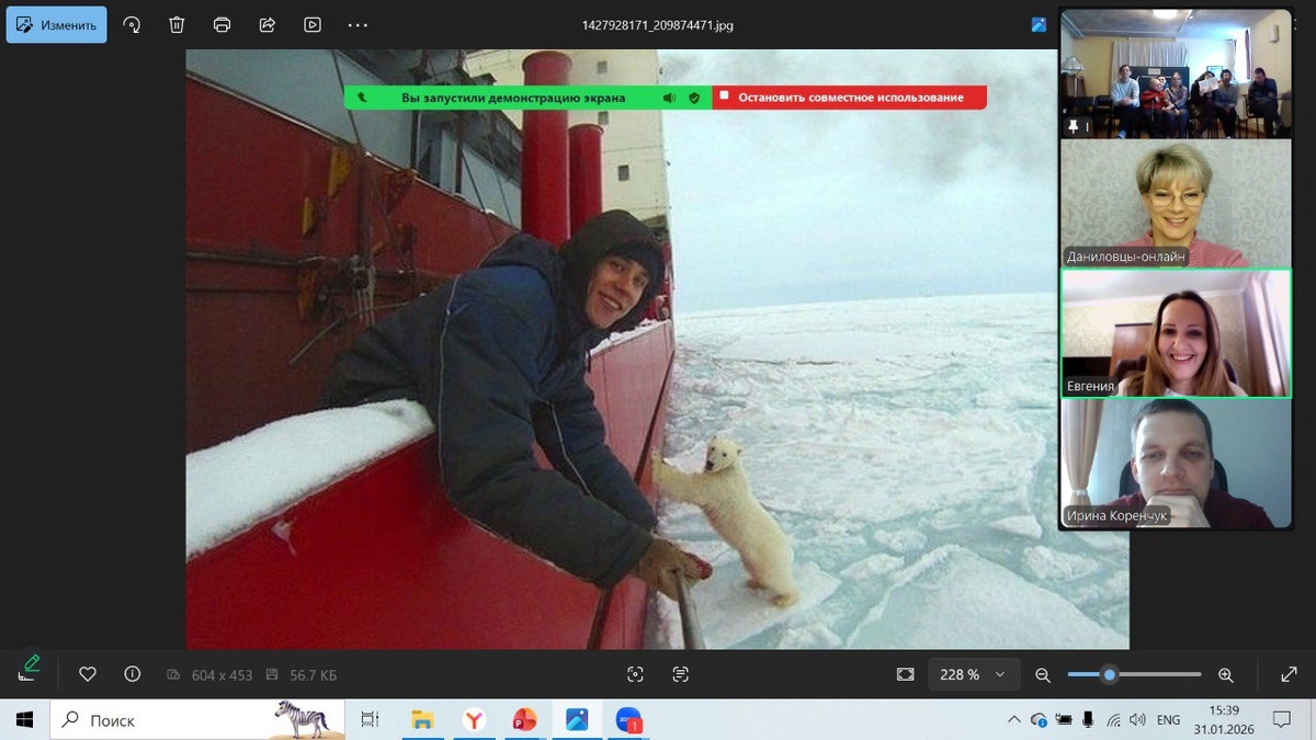 Потом мы показали ребятам несколько фотографий с животными на фоне ледоколов. Сначала на Северном полюсе с белыми медведями. Вот первое фото - медведь приветственно машет лапой. Ребята смеются, им явно нравится этот мишка. А вот фото, где три братика-медвежонка лежат вместе на фоне ледокола, а вот семья - медведица с медвежатами. А вот забавное фото, на котором медведь стоит на задних лапах, а передними опирается на ледокол. Евгения пошутила, что он помогает, толкает ледокол. И ребята засмеялись: "Да, толкает". Вот ещё один любопытный мишка, который встал на задние лапы перед ледоколом "50 лет Победы" и смотрит на команду. Команда высыпала на борт и смотрит на него.
