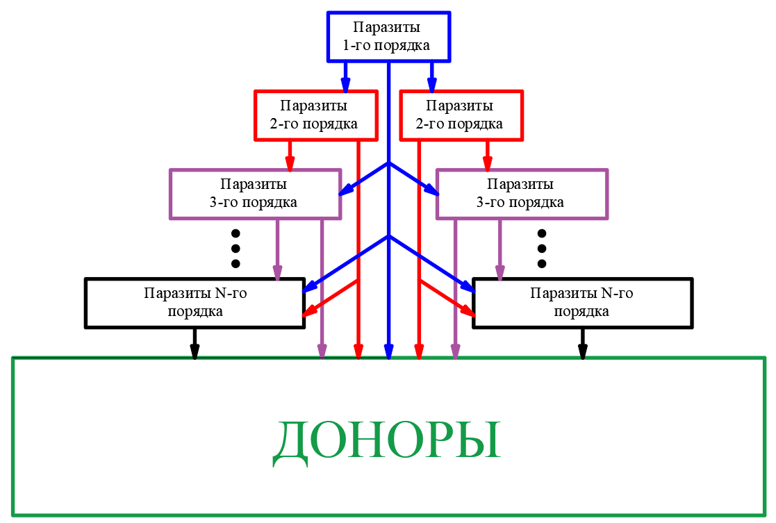 В базовой статье "Чернь - элита": порочная система общества. ч.3 была рассмотрена Иерархическая система паразитизма и схематичное её изображение. Вот оно: Паразитизм имеет "слоёную" структуру и тоже имеет свою иерархию, где чем выше порядок, тем больше возможностей и аппетитов имеет паразит. Очевидно, нередко возникает вопрос: а кто тогда самый-самый влиятельный и всемогущий паразит? Кто рулит и подчиняет себе такой масштабный процесс? Мнений по этому поводу я слышал немало. Самая распространённая гипотеза: паразитами первого порядка являются главы транснациональных корпораций и банков - именно в их руках сосредотачивается и множится капитал, а следовательно они имеют возможности подчинять своим интересам многие происходящие в глобальном обществе процессы. Называются и фамилии: Ротшильды, Рокфеллеры, Морганы, Гейтсы и т.д. Есть и более скептическая гипотеза, согласно которой единого мирового центра паразитизма в принципе не существует, а все разговоры по "мировой масонский заговор" яв