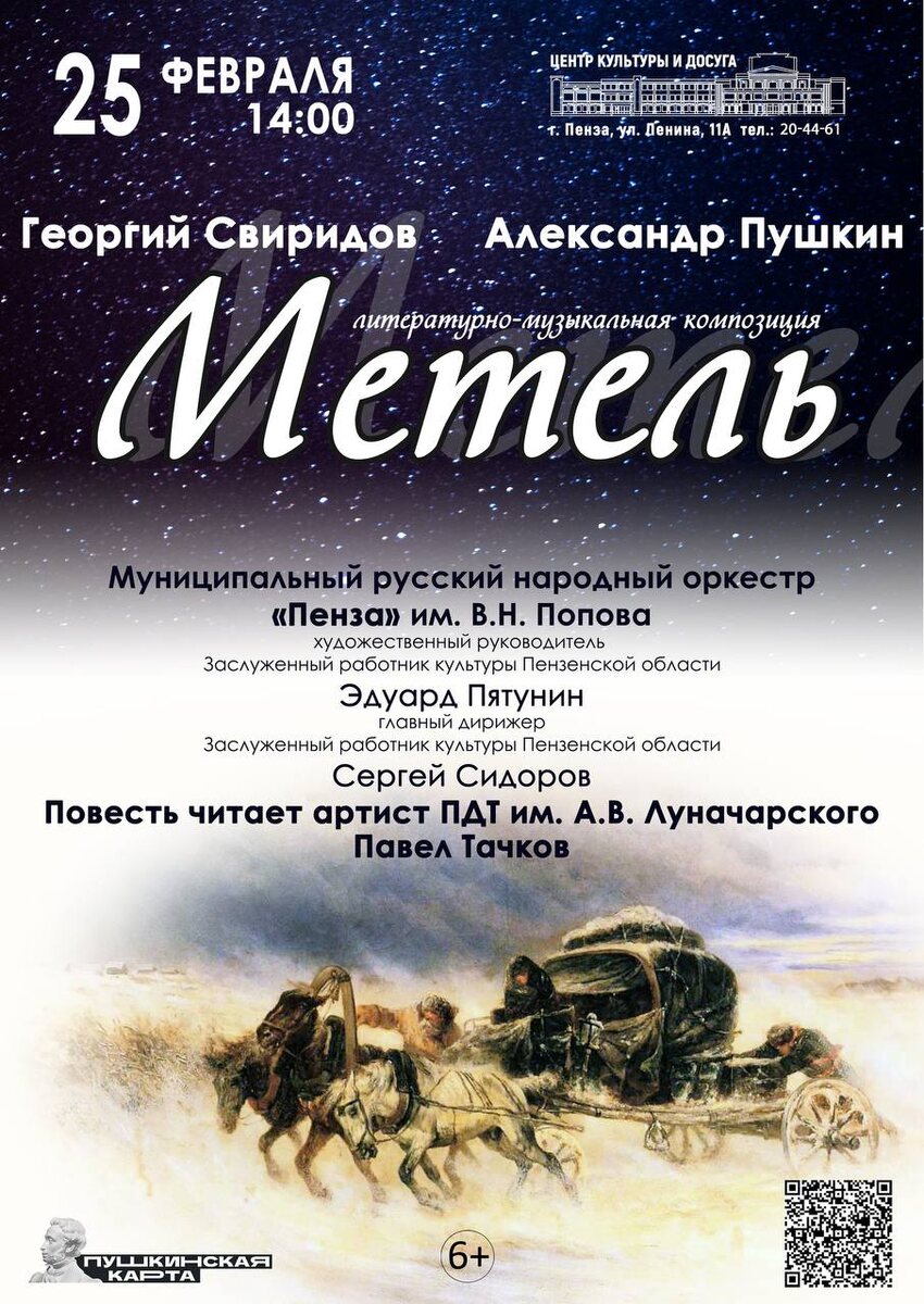 "❄ 🎶 В исполнении Русского народного оркестра "Пенза" им. В.Н. Попова зрители услышат музыкальную иллюстрацию композитора Георгия Свиридова к повести Александра Пушкина «Метель», состоящую из девяти музыкальных композиций: «Тройка», «Вальс», «Весна», «Осень», «Романс», «Пастораль», «Военный марш», «Венчание», «Отзвуки вальса», «Зимняя дорога». Повесть читает артист Пензенского драматического театра им. А.В. Луначарского Павел Тачков. В этом литературном сюжете зимняя стихия неожиданно сыграла судьбоносную роль, изменив жизнь главных героев. Победила Любовь ❤ 6+ ✅Онлайн билеты: https://iframeab-pre7560.intickets.ru/event/70178766