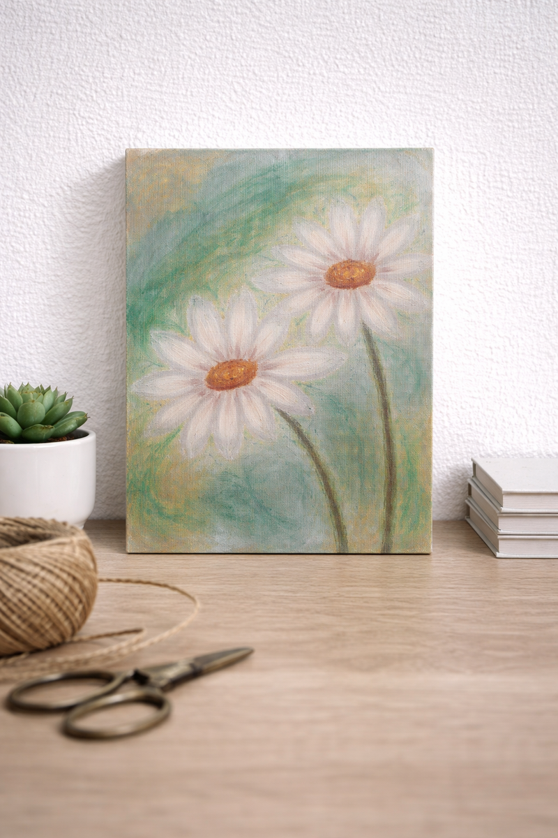 В этой работе появляется не просто второй цветок — появляется расстояние между формами. И это главное. Две ромашки расположены по диагонали. Одна чуть ниже, вторая выше и дальше. Они не смотрят друг на друга и не соприкасаются. Между ними есть воздух. Это уже не про одиночную форму, а про соотношение. Фон зелёный, многослойный, с размытыми переходами. Он не ритмичный и не контрастный — он текучий. Цвет растворяется, смешивается, не имеет жёстких границ. На этом фоне цветы выглядят мягкими, почти хрупкими. Лепестки написаны свободно. Контуры не подчёркнуты, белый не плотный — в нём серый, розоватый, лёгкая прозрачность. Это уже не утверждение формы, а её дыхание. Края местами расплываются, и цветок будто частично растворяется в пространстве. Сердцевины приглушённые, без акцента. Они не тянут на себя внимание, а лишь обозначают центр. В этой работе центр не доминирует — композиция держится на балансе двух вертикалей. Стебли тонкие, чуть наклонённые. В них больше движения, чем устойчиво