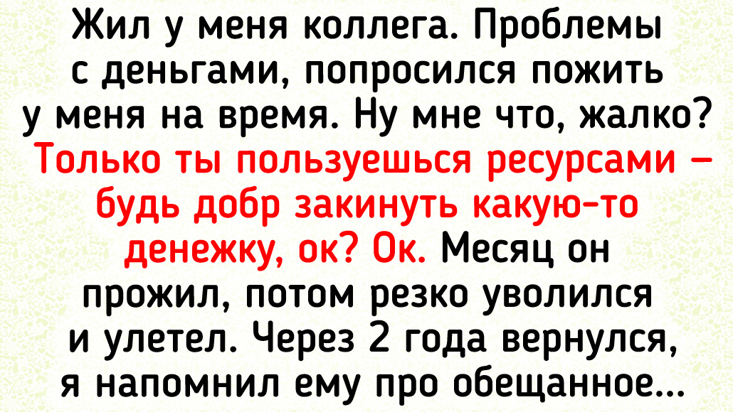 У многих в жизни бывают смутные времена, когда единственное спасение — одолжить денег у близких. Но недобросовестные люди видят в этом жесте не помощь, а средство заработка и в результате стирают в пыль даже проверенные годами отношения. Мы в ADME желаем вам такого благосостояния, чтобы и думать не пришлось о том, что нужно взять взаймы. А пока прочтите истории людей, которые в следующий раз крепко задумаются, прежде чем одолжить даже маленькую сумму. Знакомый попросил дать ₽ 3 500 на пару недель. Ну как тут не помочь — конечно, дал. Проходит месяц, другой, третий, я при встрече периодически напоминаю. Он говорит, что помнит и вернет, просто сейчас ситуация сложная. А недавно звонит и просит еще ₽ 15 000 р. На мое замечание о том, что надо бы с прошлым долгом сначала рассчитаться, а уже потом новый брать, он вполне серьезно отвечает: «Так я как раз и планировал отдать тебе долг с этих ₽ 15 000!» Конечно, я объяснил, что так это не работает, но попытка мне понравилась. © ProstoTrue / Pi