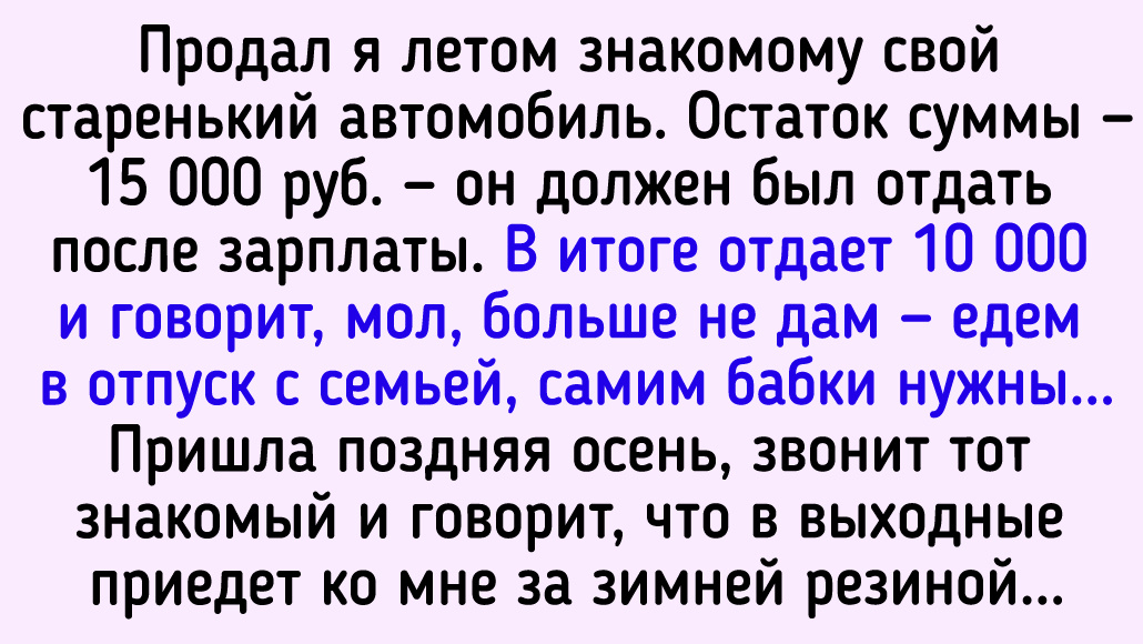 Продал я летом знакомому свой старенький автомобиль. Остаток суммы — 15 000 руб. — он должен был отдать после зарплаты. В итоге отдает 10 000 и говорит, мол, больше не дам — едем в отпуск с семьей, самим бабки нужны. Пришла поздняя осень, звонит тот знакомый и говорит, что в выходные приедет за зимней резиной, которую я любезно согласился подержать у себя в кладовке до наступления сезона. Ну я и сказал: «Какая резина? Ты же все забрал уже! Расскажи лучше, как в отпуск съездил?» Он пытался наезжать и угрожать, но я не испугался, а резину продал в интернете за те же 5 000. © Dimetrisol / Pikabu