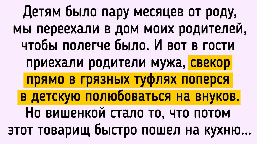 Детям было пару месяцев от роду, мы переехали в дом моих родителей, чтобы полегче было. И вот в гости приехали родители мужа, свекор прямо в грязных туфлях поперся в детскую полюбоваться на внуков. Но вишенкой стало то, что потом этот товарищ пошел на кухню и стал заглядывать в кастрюли и проверять, чем же сваха его будет потчевать. После того уже у моей мамы глаз дергался. И такая беспардонность сопровождала меня все то время, что я с ним общалась. © Lubava Lubovna / ADME