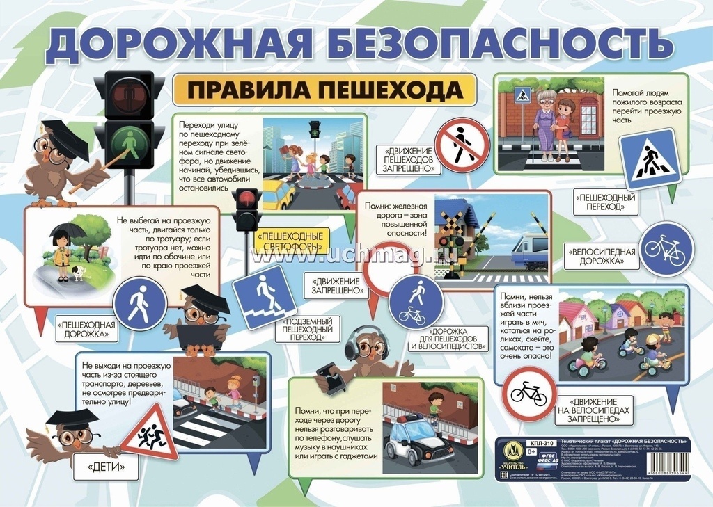 Дорожная безопасность. Правила пешехода: Формат А2 Арт. КПЛ-310 ▶https://www.uchmag.ru/estore/e2834499/ Представляем красочный плакат "Дорожная безопасность", который станет прекрасным наглядным пособием для развивающих занятий, рассказывающих детям о знаках дорожного движения, правилах поведения на дороге. Может послужить в качестве декорирования доступных помещений в любой организации с тем, чтобы дети с родителями или школьники самостоятельно знакомились с важными для безопасности и сохранения жизни нормами, а также для проведения различных профилактических мероприятий по дорожной безопасности. Плакат удобен в использовании: его легко повесить в нужном месте и мобильно перенести на другое, он малогабаритного формата, поэтому не занимает много места, но зато и содержанием, и интересным ярким дизайном очень привлекает внимание детей. Предназначен воспитателям ДОО, учителям, классным руководителям, организаторам внеурочной деятельности, педагогам дополнительного образования, оформител