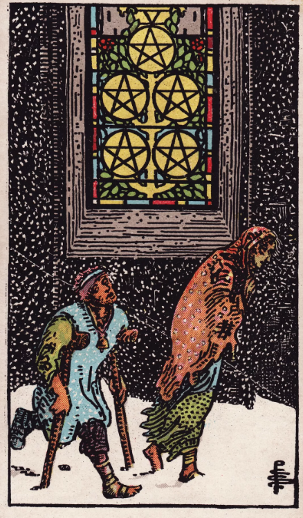 Особенность карты: она показывает не объективную нужду, а отказ от помощи из гордости, выученной беспомощности или депрессии. В колоде Райдера-Уэйта одна фигура явно прихрамывает, у второй — колокольчик прокаженного на шее (или перевязанная нога). Травма уже случи