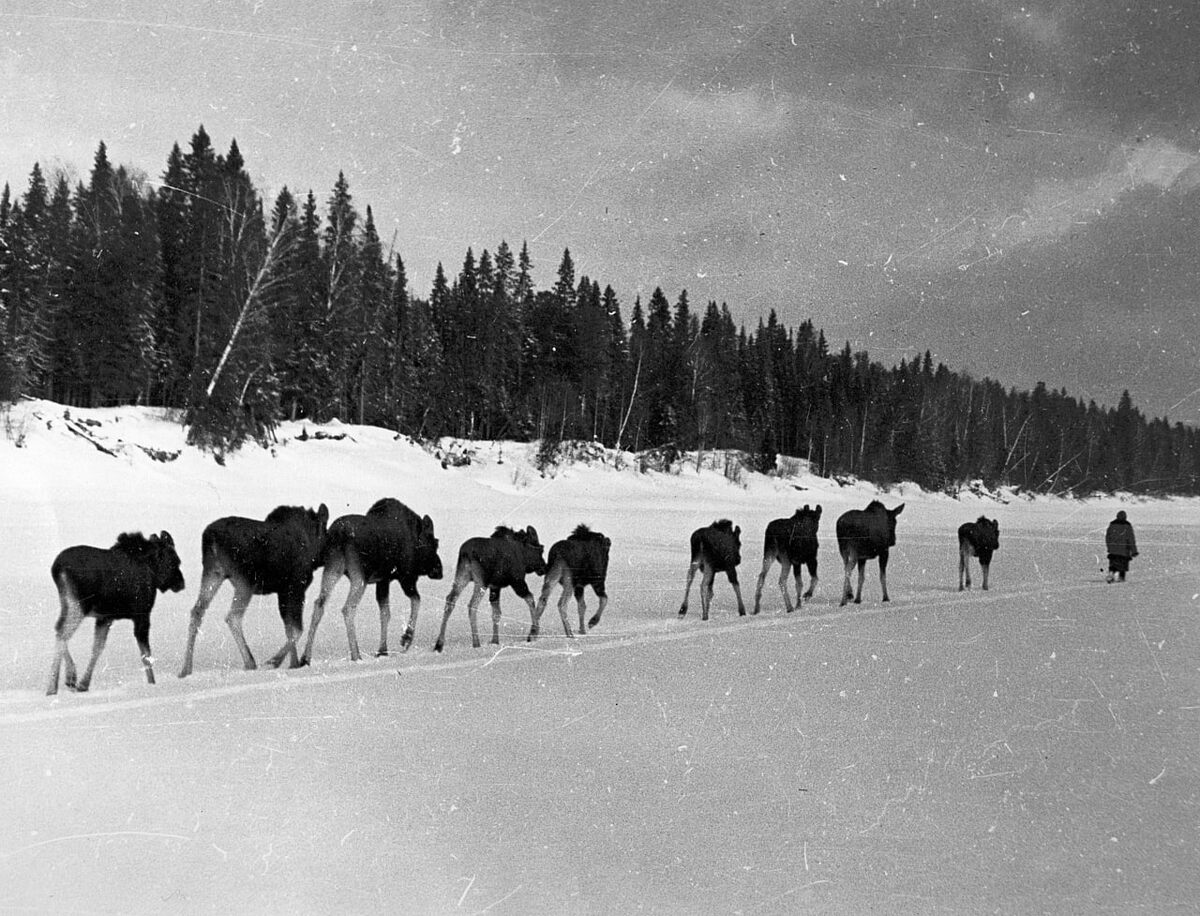 📷 На этом архивном фото 60-х годов запечатлён отвод лосей на вольный выпас. Такой способ содержания лосей зимой был наиболее рационален, так как в это время года кормовые ресурсы ограничены и лосям для выпаса нужна гораздо большая площадь. Выпас осуществлялся таким образом: Утром, после подкормки работник фермы отводил стадо на пастбище и подрубал деревья. Лучшие пастбищные участки в районе фермы выявлялись с помощью самих же лосей. Если место неудачное, лоси уйдут и будут бродить до тех пор, пока не остановятся в районе, более отвечающем их кормовым потребностям. После того как лоси наедятся и лягут, человек незаметно (иначе лоси потянутся за ним) уходил до следующего дня. Утром он возвращался и вёл лосей обратно на ферму, где они получали сочный корм. Часть лосей находилась на вольном выпасе в лесу постоянно. Что характерно - такое длительное пребывание одомашненных лосей на воле совсем не способствовало их одичанию. Источник: Лосеферма Печоро-Илычского заповедника