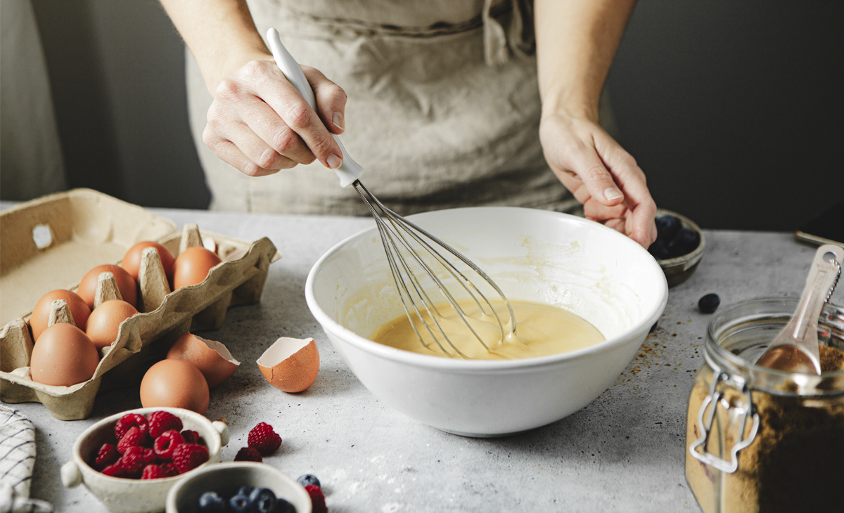 Классический метод замеса: в большой миске слегка взбейте яйца с сахаром и солью, влейте примерно половину молока (500 мл) и тщательно размешайте.