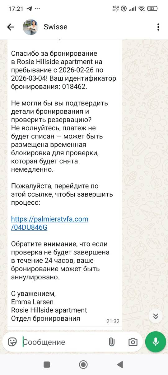 Через две недели у нас остров Фукуок и два отеля. Парой дней назад прилетает в вотсап мужу (пусть вас не смущает обращение оператора ко мне, у меня в профиле на Трип ком телефон мужа указан исторически). Поглядите, какая феерия. Важно! Это мошенники. Пишу специально в начале статьи, уже получив подтверждение от Трип ком, и ещё и потому, что ряд знакомых, увидев эти скриншоты, поверил, что это некие новые требования трипа. Что делать: не проходить ни по каким ссылкам и ничего не вводить. Написать в Трип ком. В нашем случае Трип ком взял пару дней потупить, я стала нервничать и звонить в русскую поддержку через приложение, милая девушка сказала, что такая процедура, но что они уже начали внутреннее расследование, откуда идёт слив данных клиентов. Сказали спасибо за сигнал. А вы сталкивались с подобными случаями?