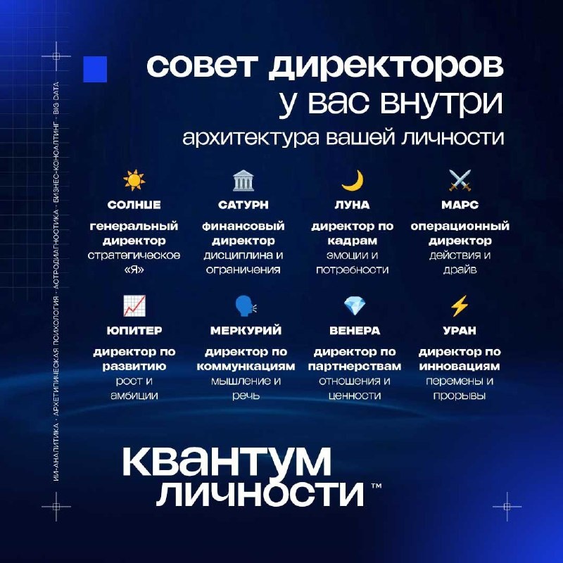 И они друг друга ненавидят. Нет, это не метафора. Это архитектура вашей личности - если читать её на языке бизнеса. У каждого - внутренний «совет директоров». В терминах карты - десять планет, каждая отвечает за свою функцию: ☀️ Солнце - генеральный директор. Стратегическое «Я». Кто вы в большом масштабе. 🌙 Луна - HR-директор. Эмоции, потребности, внутренний комфорт. 🗣 Меркурий - директор по коммуникациям. Как думаете и говорите. 💎 Венера - директор по партнёрствам. Отношения, ценности, эстетика. ⚔️ Марс - операционный директор. Действия, драйв, конфликты. 📈 Юпитер - директор по развитию. Рост, амбиции, масштаб. 🏛 Сатурн - финансовый директор. Дисциплина, ограничения, долгосрочный план. Плюс Уран (инновации), Нептун (интуиция), Плутон (трансформация). А теперь представьте. Генеральный директор хочет одного. Финансовый - другого. HR-директор - третьего. Операционный директор вообще работает против стратегии генерального. Знакомо? Это не «вы не можете определиться». Не
