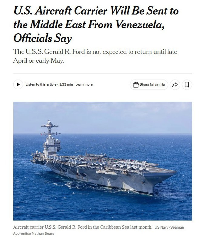 Авианосец USS Gerald R. Ford с кораблями сопровождения будет переброшен на Ближний Восток, пишет New York Times. По словам источников издания, экипаж корабля был проинформирован об этом в прошедший четверг и теперь сможет вернуться в порт приписки не ранее конца апреля-начала мая 2026 года. Напомним, что «Джеральд Р. Форд» является головным кораблем новой серии американских атомных авианосцев, приходящих на смену знаменитым «Нимицам». В январе 2026 года АУГ во главе с USS Gerald R. Ford принимала участие в нанесении ударов по Венесуэле, а теперь имеет все шансы поучаствовать и в ударах по Ирану. Таким образом, данная авианосная ударная группа станет как минимум второй после USS Abraham Lincoln, отправленной на Ближний Восток, либо третьей, если подтвердится переброска туда АУГ USS George H. W. Bush. #Иран #США Военный Осведомитель