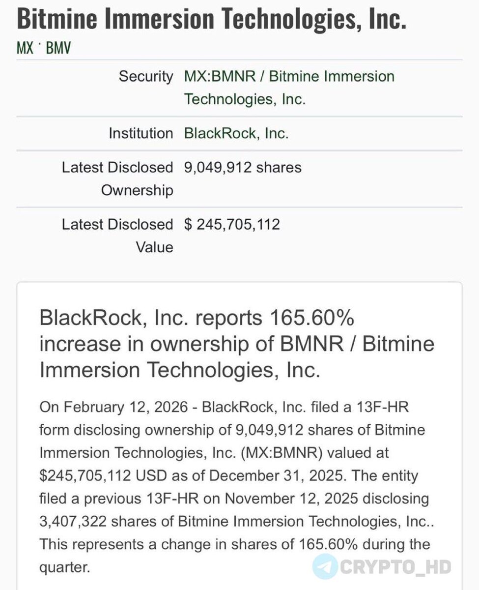 🔥 Инвестиционный гигант BlackRock почти в 3 раза увеличил свою долю в компании BitMine (до 9m акций) – форма 13F Напомним, BitMine (Тома Ли) является крупнейшим корпоративным холдером #ETH. Ранее: Том Ли не сдается Cryptо Headlines