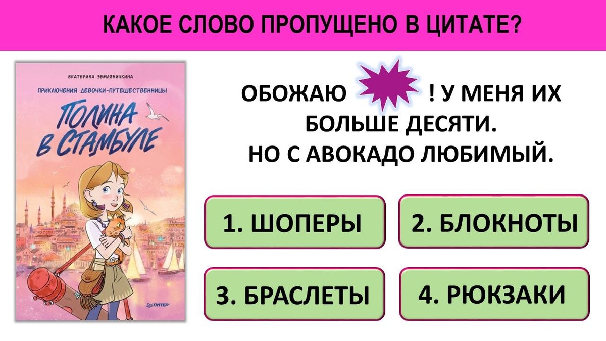 Предлагаем сегодня ответить на вопрос по книге Екатерины Земляничкиной "Полина в Стамбуле". Пишите ваши варианты в комментариях, а заодно расскажите, любите ли вы это так же, как Полина? Фотодоказательства приветствуются!)) Ваш #ЗемляничныйКлуб 🍓 Подписывайтесь на наш телеграм-канал