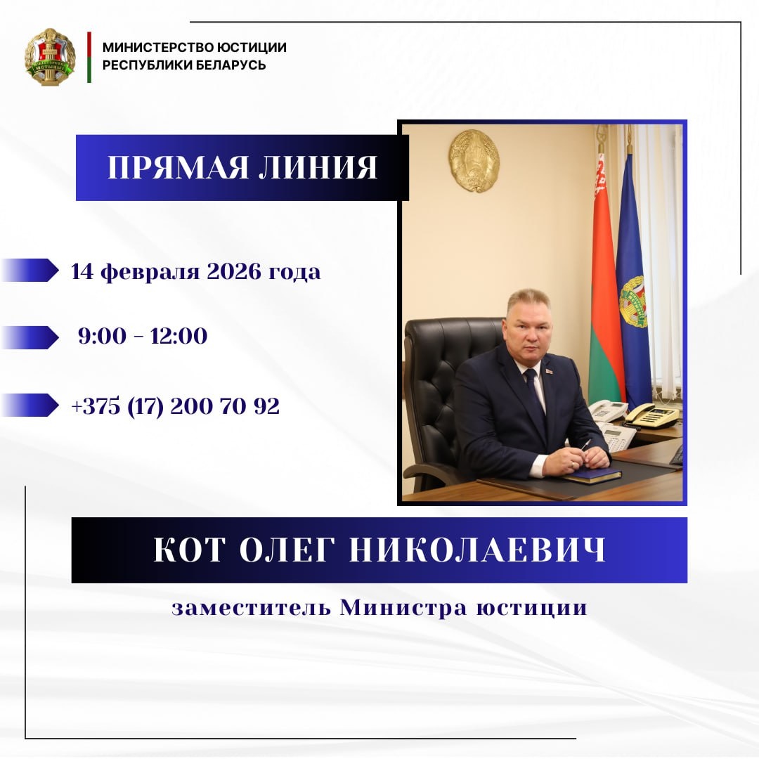 👥👥 🗓 14 февраля 2026 года с 9:00 до 12:00 прямую телефонную линию по актуальным вопросам деятельности Министерства юстиции проведет заместитель Министра юстиции Кот Олег Николаевич. 📞 8 017 200 70 92 💪💪💪💪| Сайт | Telegram | Instagram | YouTube