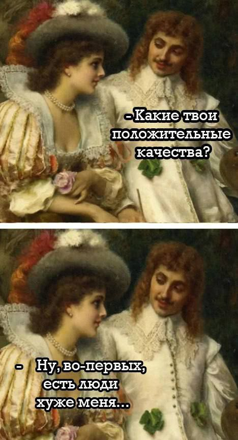 Великая целительная сила мемов заключается в том, что есть темы и ситуации, которые людям неудобно обсуждать друг с другом. Сегодня не обязательно идти к семейному психологу, когда можно отправить смешную картинку, намекнуть, разрядить "грозовые тучи" между мужчиной и женщиной. Возвращаю эту рубрику в пятницу, где ей всегда было место. Обещаю, что со следующей недели начну писать здесь про своё последнее путешествие. Так я припру свою лень к стенке. *** Итак, баянистые мемы про нас. Помним, что откровенный разговор на первом свидании - залог второго☝ *** Второй совет пригодится мужчинам и женщинам. Всегда указывайте ваши конкурентные преимущества на сайте/сервисе знакомств. На языке маркетологов это называется - "отстройка от бренда" (конкурента). *** Смелость города берёт, а честность - сердца и репродуктивные органы☝ *** Иногда лучшая тактика - это не осада крепости, а само игнорирование её. *** Каждый полководец должен знать, что некоторые ворота никогда не откроются. *** Иногда ср