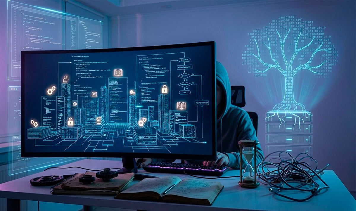 Перед нами не просто программист за работой, а архитектор новой реальности. Посмотрите на монитор: город здесь — это не бетон и стекло, а структурированная логика. Здания — это сложные алгоритмы, дороги — потоки данных, замки́ — системы безопасности, а шестеренки — процессы автоматизации. Справа из серверной стойки растет "Древо Познания" цифровой эпохи, сотканное из бинарного кода (нулей и единиц). Оно питает этот виртуальный город. А на столе — физический мир: старые книги (фундаментальные знания), механические детали (основа инженерии), спутанные провода (хаос реальности) и песочные часы (время, необходимое для мастерства). Человек в капюшоне — посредник между этими мирами. Он превращает хаос мыслей и груду железа в стройную, сияющую цифровую вселенную. Это и есть магия XXI века.