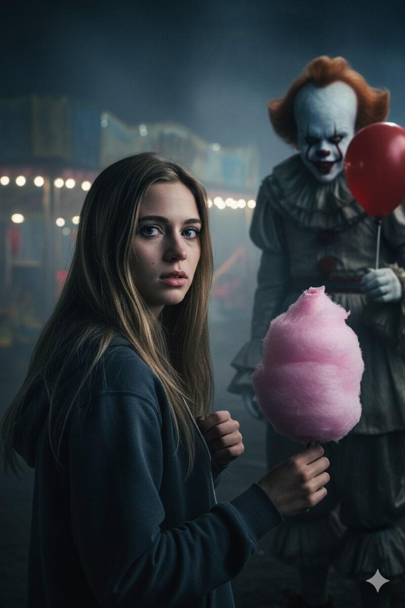 Модель: Nano Banana Сгенерировать🪄 Создайте мрачный, фотореалистичный постер ужасов на основе моего селфи, сохранив точное лицо и черты. На переднем плане я на ночном карнавале, держа в руках розовую сахарную вату. Сцена выглядит естественной и реалистичной, как фотография — мое выражение лица тревожное, как будто я чувствую что-то позади себя. На заднем плане, у угла кадра, частично скрытый тенями и огнями карнавала, стоит танцующий клоун Пеннивайз, точно такой же, как в фильмах «Оно» — белый грим, ярко-рыжие волосы, желтые глаза, резкая улыбка и один светящийся красный воздушный шар. Он должен быть слегка размыт из-за расстояния, но четко узнаваем, создавая ощущение ужаса. Стиль — мрачный и реалистичный, с тусклыми огнями карнавала, туманом в воздухе, приглушенными цветами с холодными тонами, сильным контрастом, кинематографическими тенями. Композиция должна напоминать кадр из фильма ужасов, ультрареалистичная, мрачная и очень детализированная. На изображении не должно быть текста